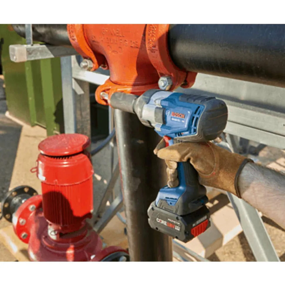 The Bosch GDS18V-770 18V PROFACTOR 3/4 In. Impact Wrench with Friction Ring and Thru-Hole is designed for breaking free and driving large bolts, nuts and anchors quickly. It is part of the PROFACTOR System, which pairs BITURBO Brushless Technology with a CORE18V PROFACTOR battery. BITURBO Brushless Technology is a high-performance motor and drive-train system designed to deliver power comparable to high-demand corded tools. The tool delivers up to 770 Ft.-Lbs. fastening torque and 1,250 Ft.-Lbs. breakaway torque, while maintaining long runtime. It offers controlled power output, with three speed/torque settings (0-800/1,200/1,750 RPM).