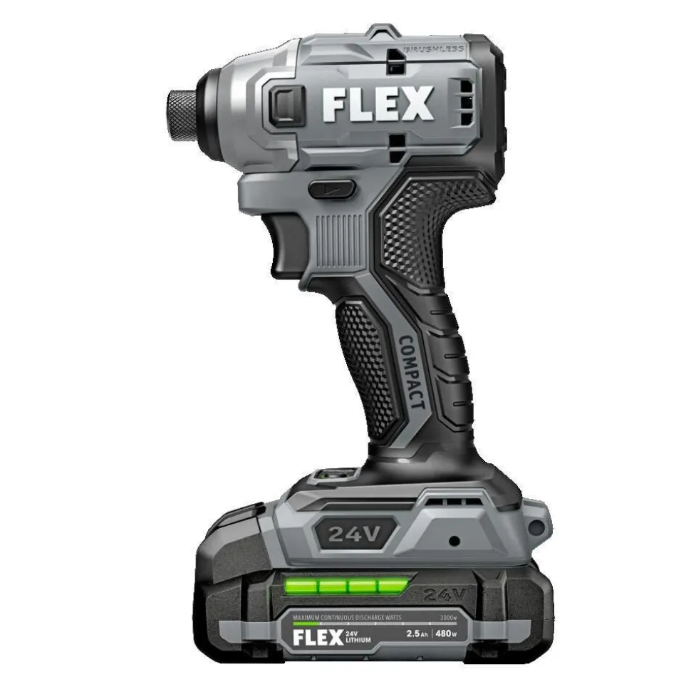 The FLEX 24V 1/4” Hex Compact Impact Driver packs big power into a compact size so you can power through the day with a lightweight, durable tool built to conquer hard-to-reach spaces. This compact cordless impact driver is 17 percent lighter weight than its larger counterpart, FX1351, and an ideal tool for electricians, HVAC pros, and driving tech screws for metal framing. It includes two speed modes for more control while fastening screws, and Self-Tapping Screw Mode optimizes this impact screwdriver to avoid over-tightening, breaking, or stripping. This compact ¼-inch impact driver delivers exceptional runtime with the ability to drive up to 350 3-inch screws into 2×4 lumber with the included FLEX 24V 2.5Ah lithium battery. This compact impact driver delivers the FLEX Advantage of unmatched battery power, runtime, and fast charging. The impact driver set includes the cordless impact driver, a 2.5Ah lithium battery, and 160W Fast Charger.