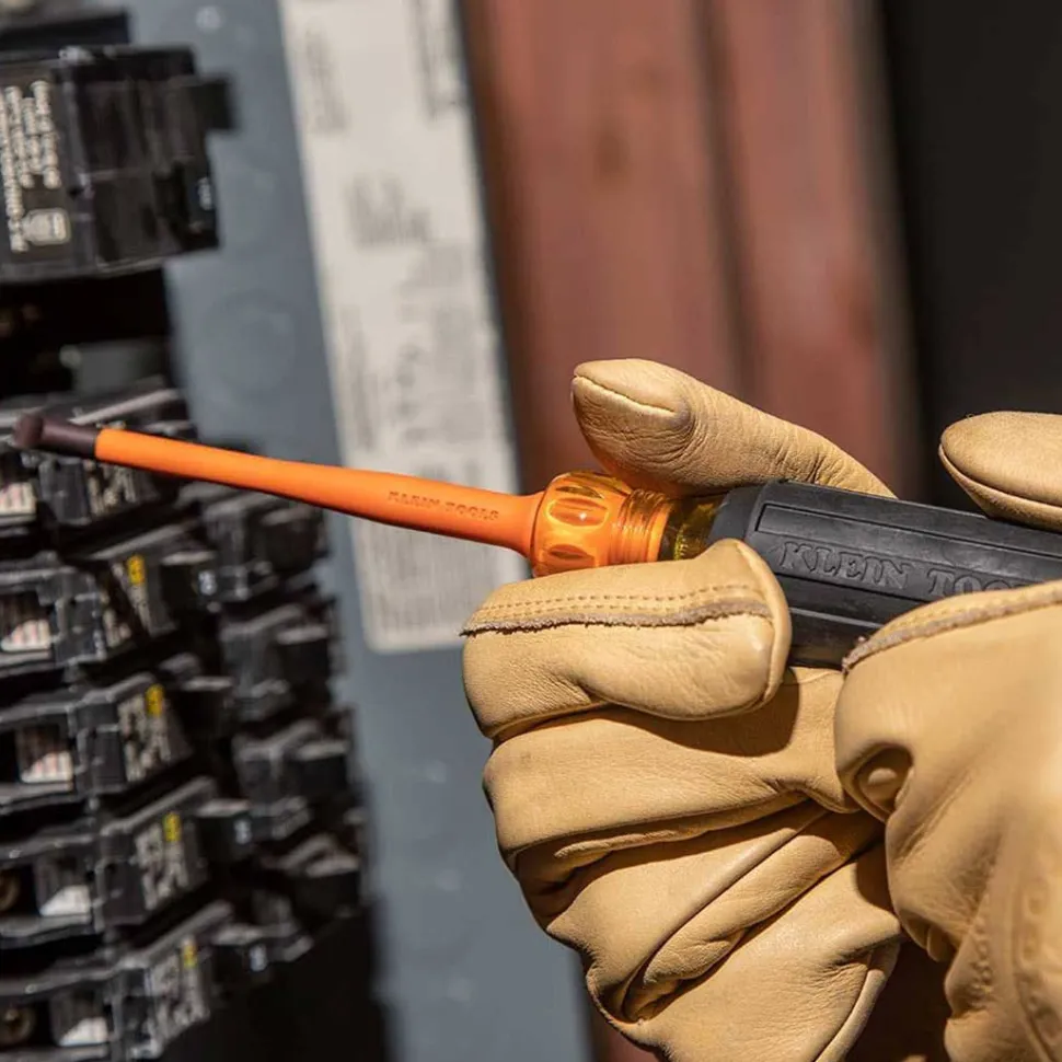Klein Tools’ Slim-Tip Insulated Screwdrivers have slim profile tips that allow for greater access into terminal blocks, slim-style breakers, or other tight spaces near energized sources. A bright orange coating of insulation protects from electrical shock, is flame and impact resistant, and sits flush with the tip helping to reduce insulation chipping and cracking. Klein insulated tools exceed the ASTM F1505 standards for insulated tools, and are clearly marked with the official 1000V rating symbol. A must-have for any electricianï¾’s tool bag, these screwdrivers are available in 4-Inch and 6-Inch lengths and a variety of tips.