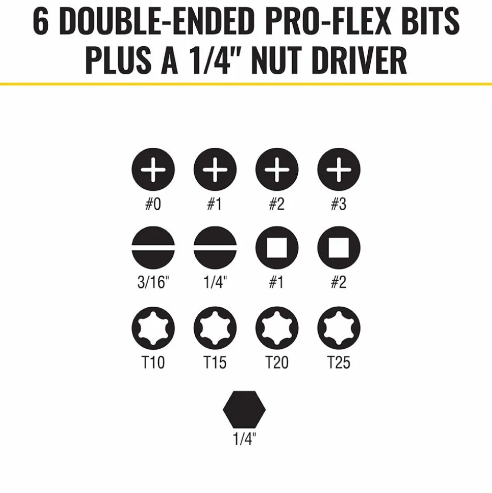 - Double-ended, pro-flex bits store directly in the screwdriver handle