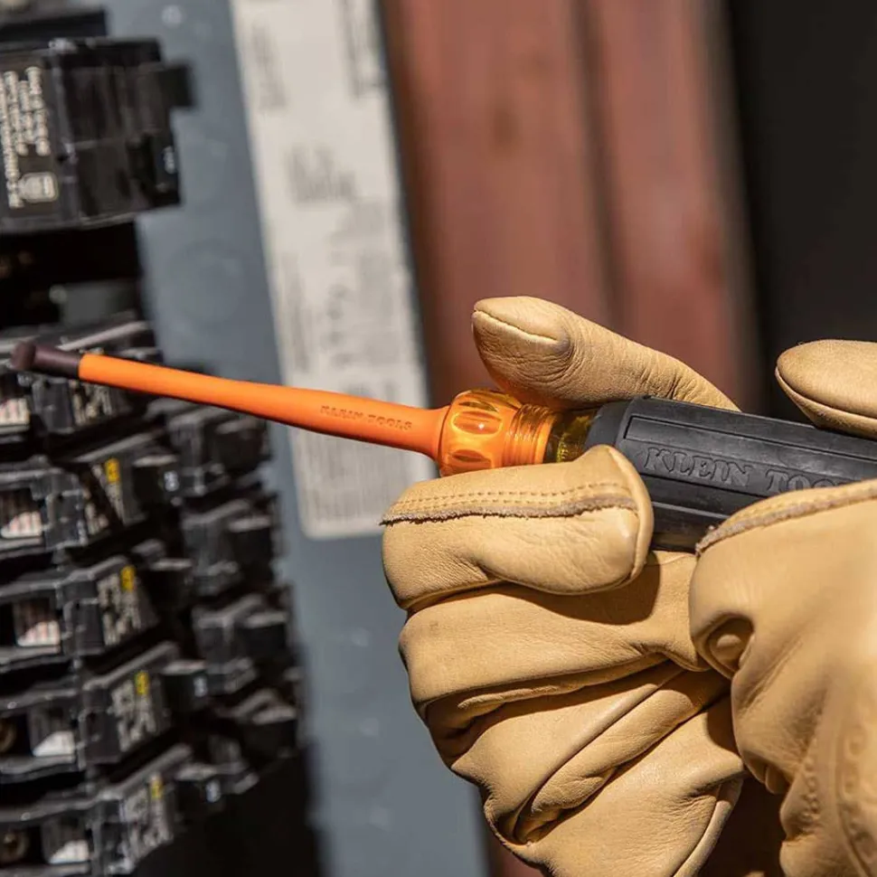 Klein Tools’ Slim-Tip Insulated Screwdrivers have slim profile tips that allow for greater access into terminal blocks, slim-style breakers, or other tight spaces near energized sources. A bright orange coating of insulation protects from electrical shock, is flame and impact resistant, and sits flush with the tip helping to reduce insulation chipping and cracking. Klein insulated tools exceed the ASTM F1505 standards for insulated tools, and are clearly marked with the official 1000V rating symbol. A must-have for any electricianï¾’s tool bag, these screwdrivers are available in 4-Inch and 6-Inch lengths in a variety of tips and sizes.