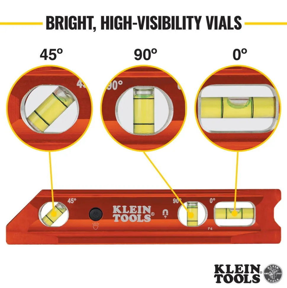 - Large, easy-to-read high-visibility vials at 3 angles: level, 90, and 45 degrees