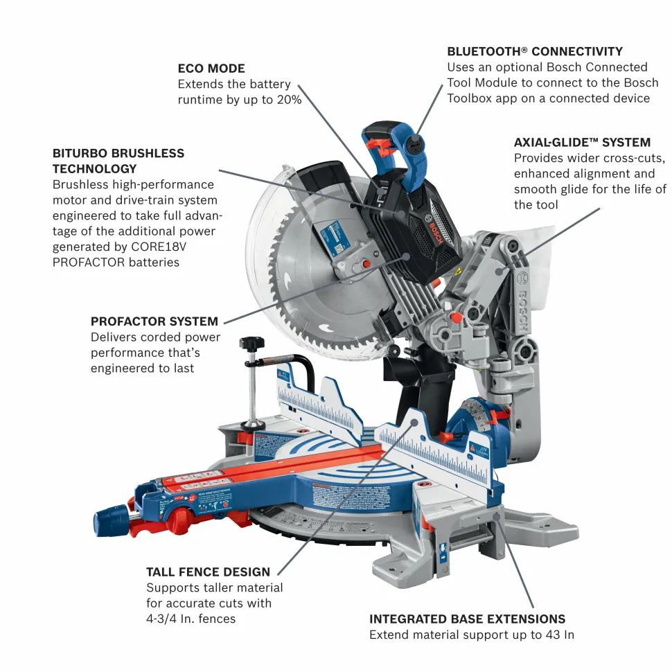 - Axial-Glide™ system – has an articulating arm, for wider cross-cuts enhanced alignment, and smooth glide while taking less space
