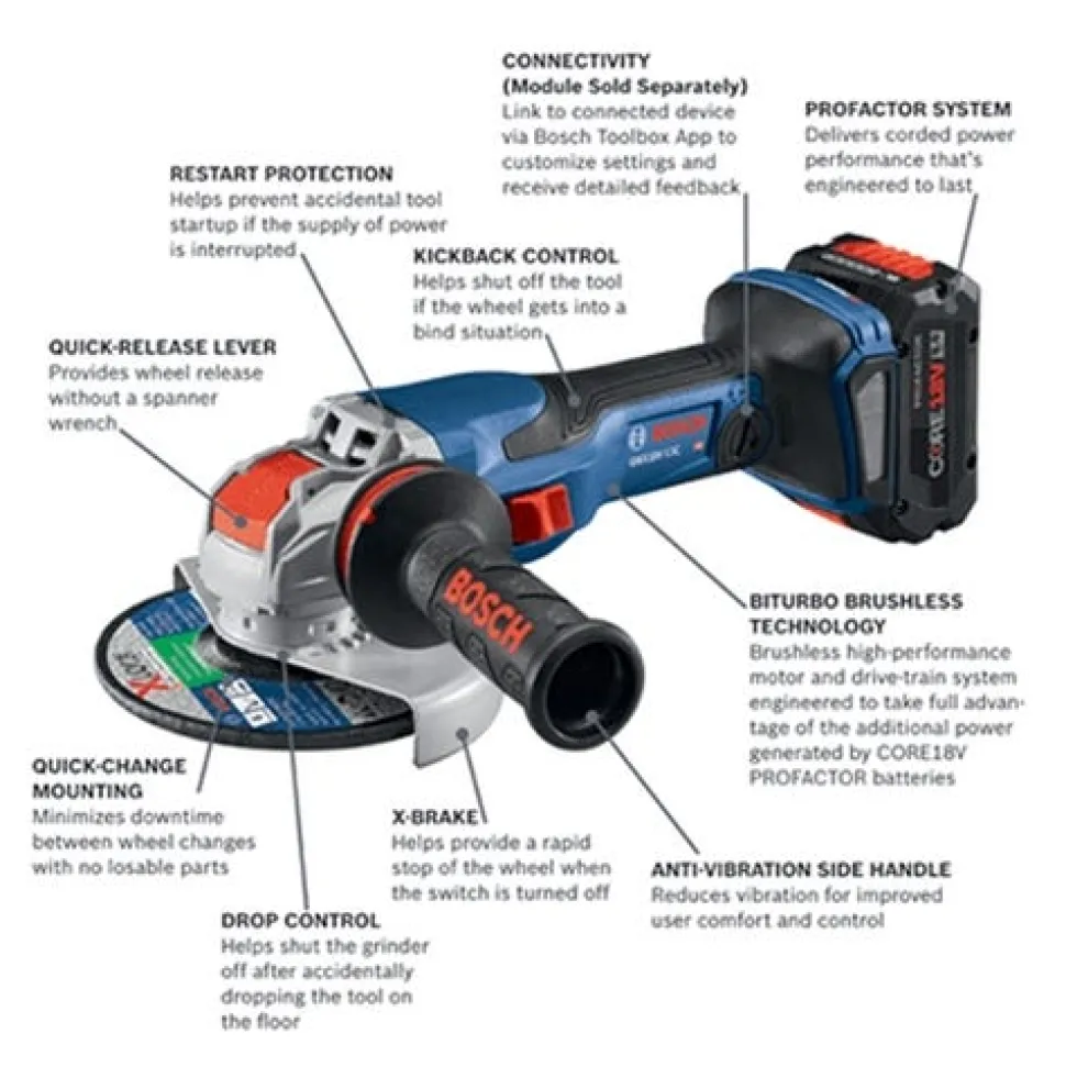 The Bosch GWX18V-13CB14 18V Spitfire X-LOCK Connected-Ready 5 – 6 In. Angle Grinder with Slide Switch kit features a tool that delivers the ultimate combination of performance; control and power in a cordless grinder. The wheel mounts properly without the need for a spanner wrench or flange nuts. The wheel is released from the grinder with the pull of a lever. This tool is part of the PROFACTOR System; which pairs BITURBO Brushless Technology with a CORE18V PROFACTOR battery. BITURBO Brushless Technology is a high-performance motor and drive-train system designed to deliver power comparable to high-demand corded tools. It features connectivity (module sold separately); providing a link to a connected device via Bosch Toolbox App to customize speed selection and individual mode setting.
