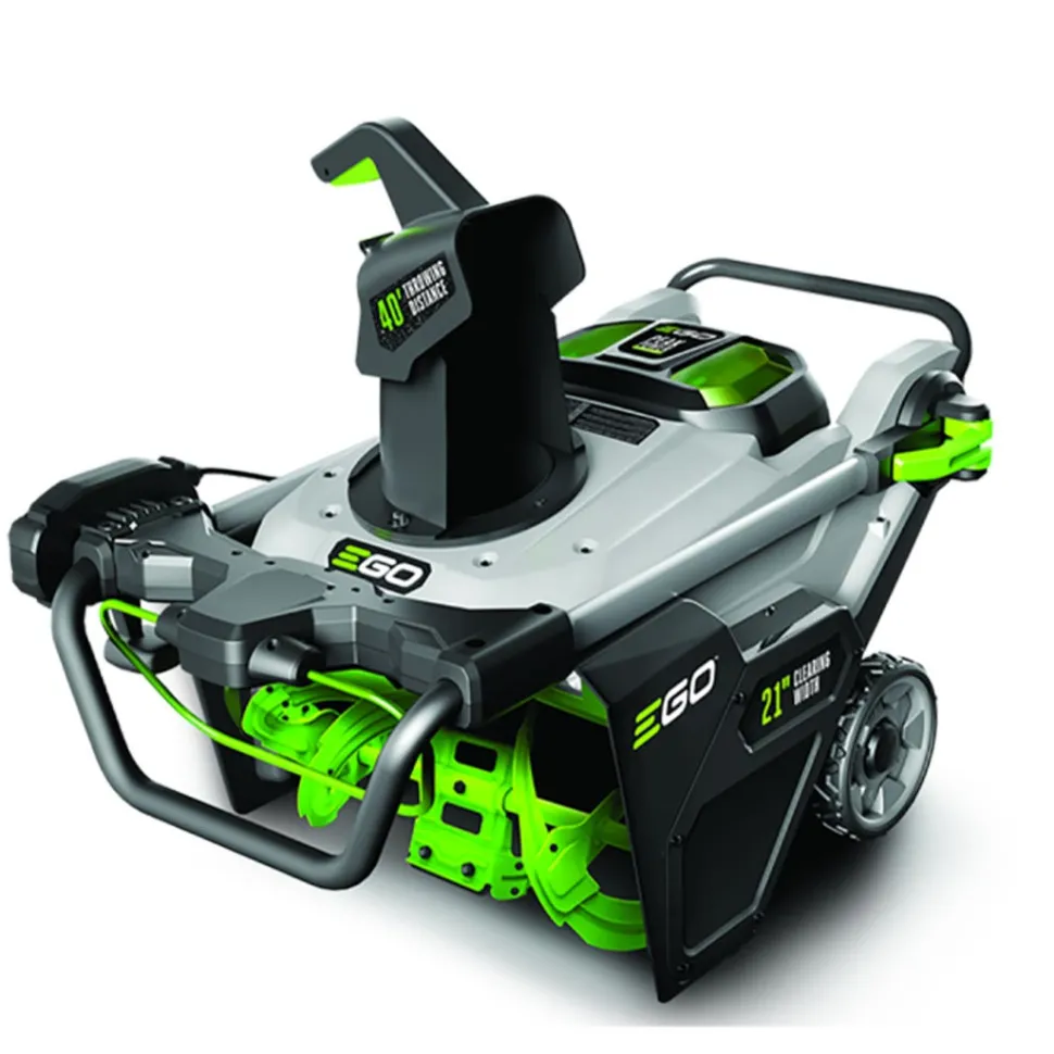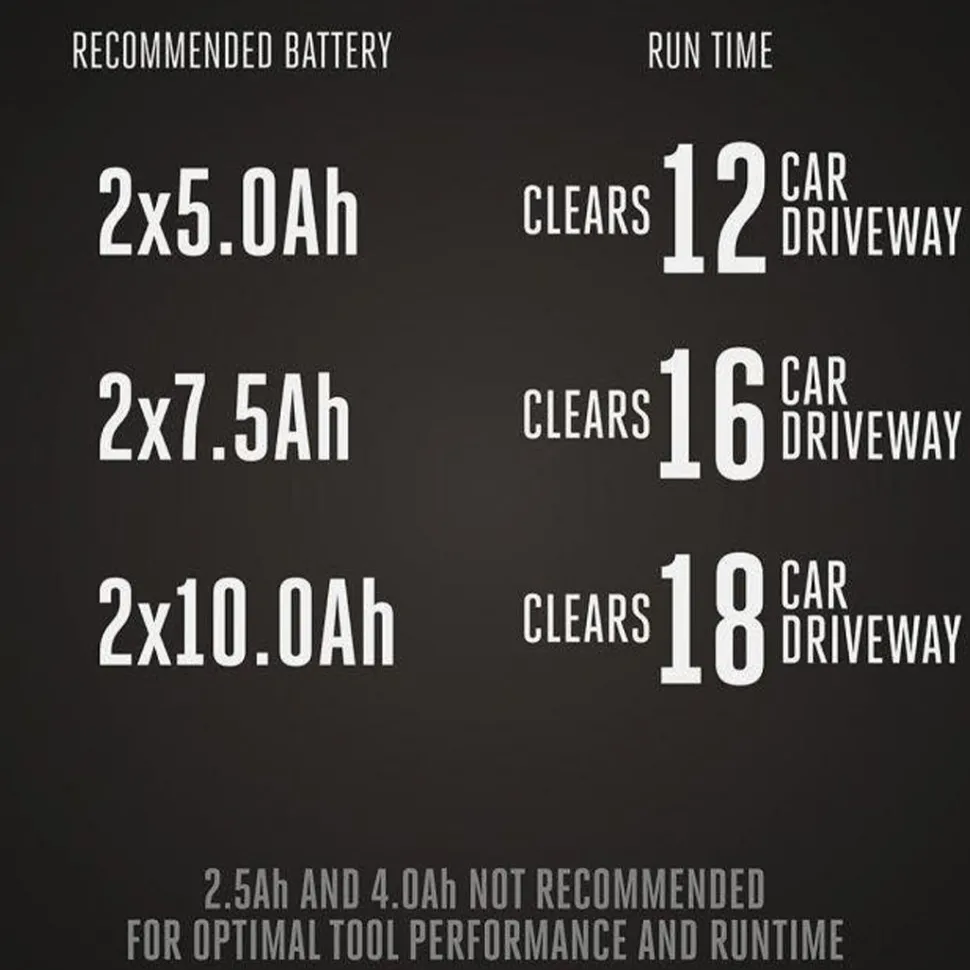 - Recommend for use with two EGO 56V 5.0 Ah ARC Lithium batteries to clear 8″ of snow on a 12 car driveway.