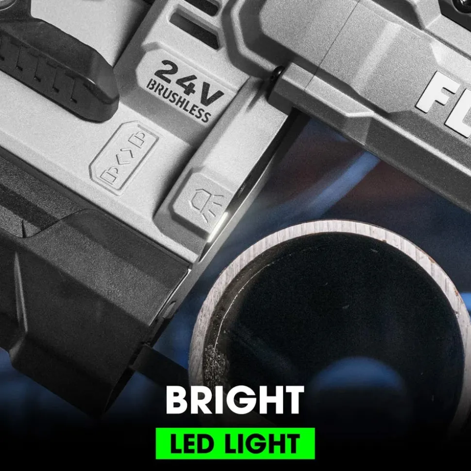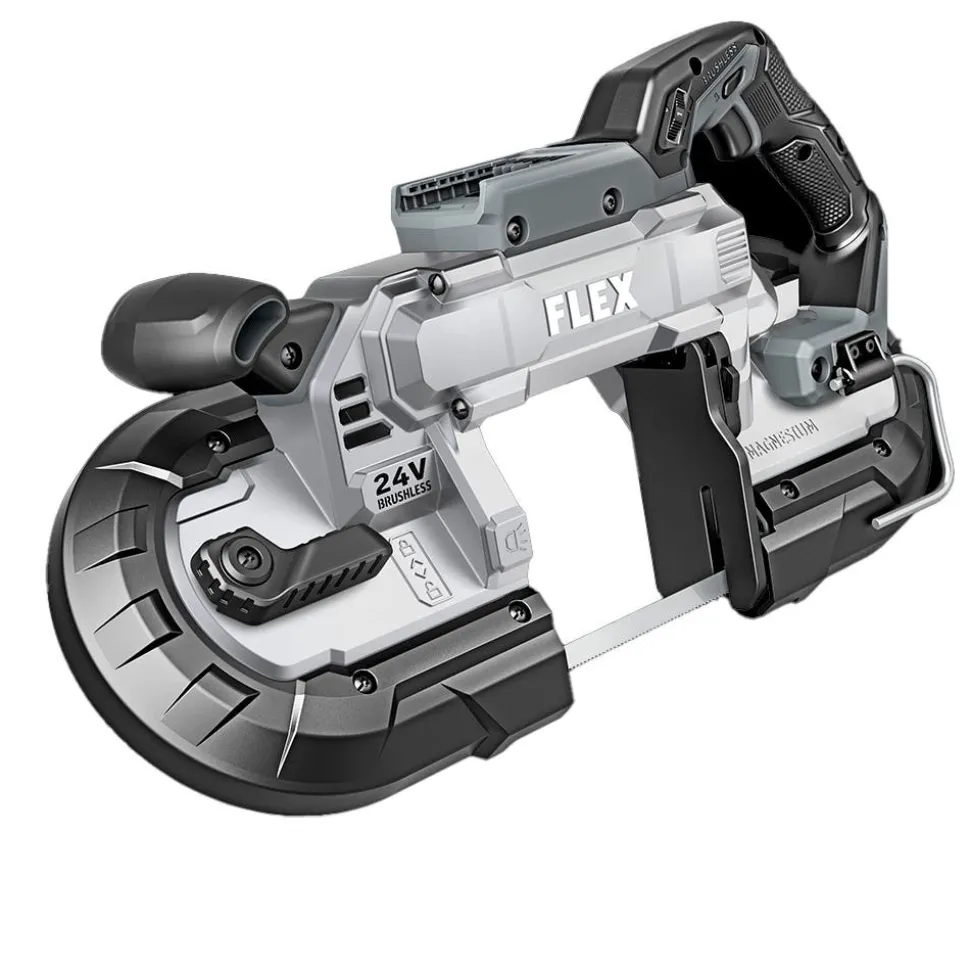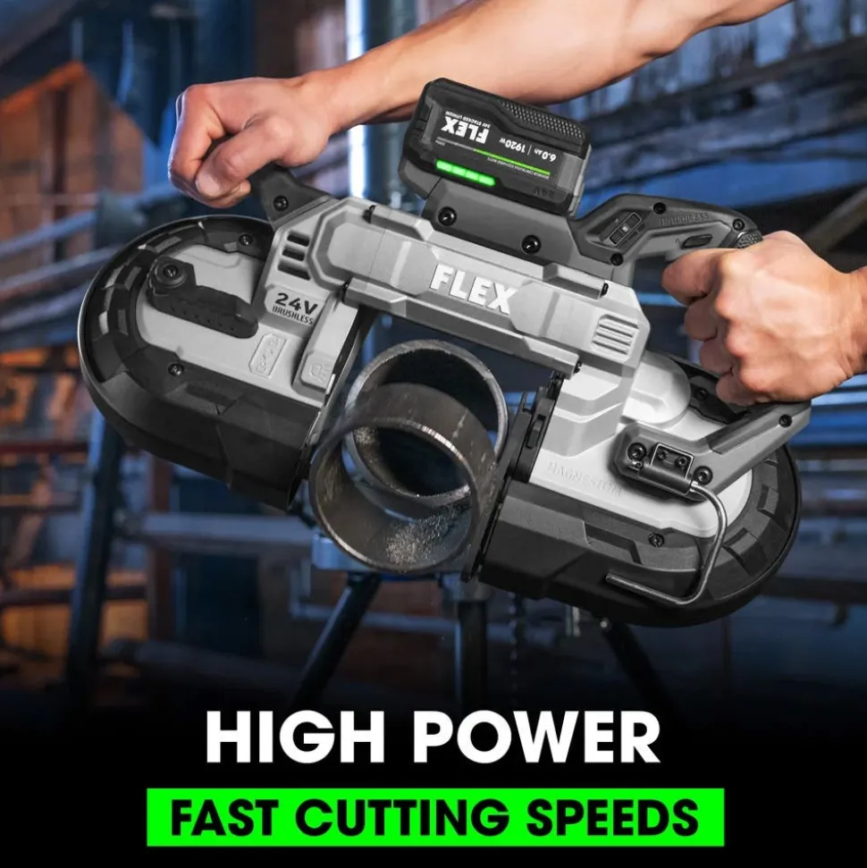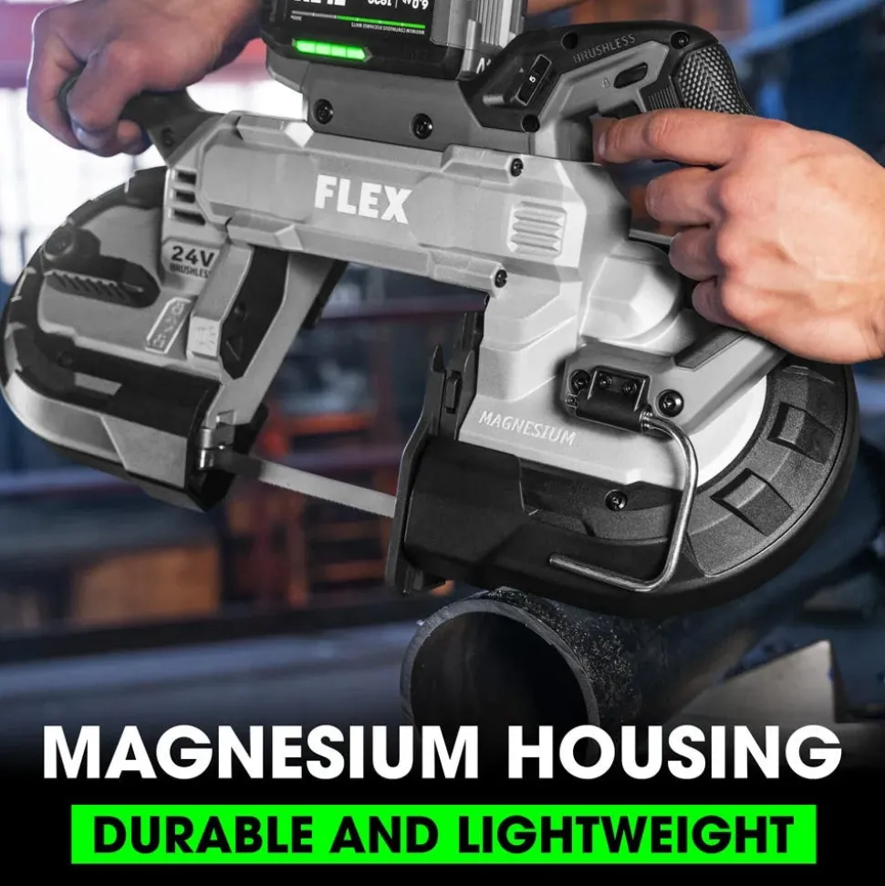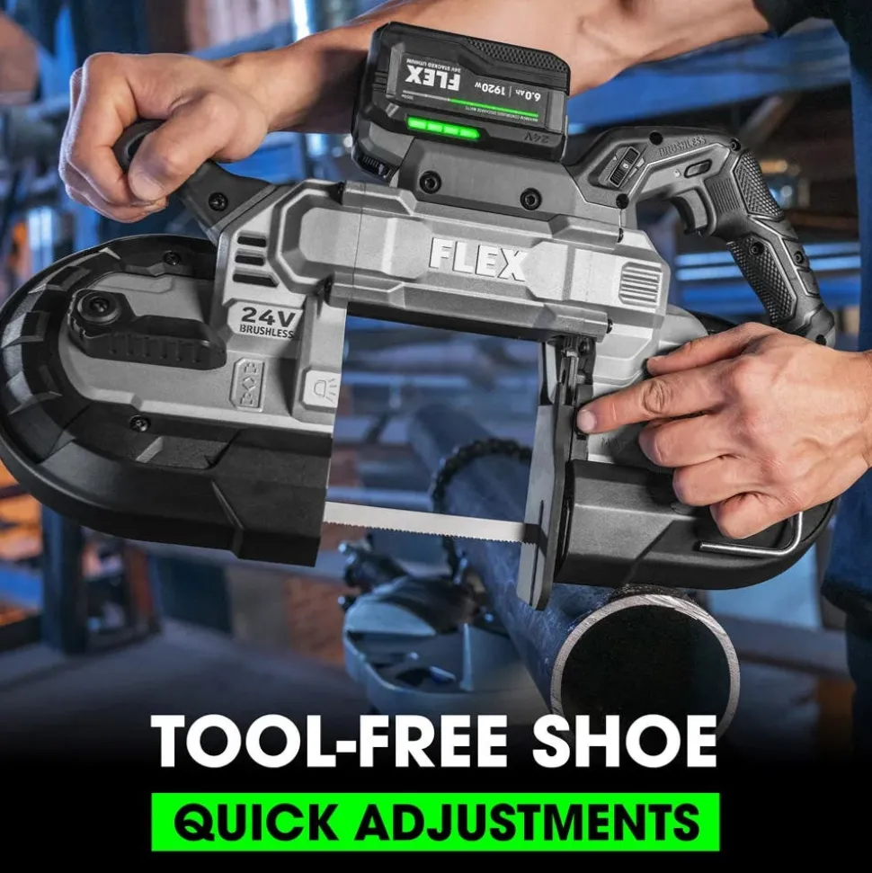 Power through large PVC pipe, angle iron, and up to 4-inch black iron pipe with the FLEX 24V 5” Deep Cut Band Saw. This powerful cordless band saw features a high-power brushless motor that provides fast cutting speeds along with a lightweight magnesium housing for maximum durability. Its tool-free quick adjustment shoe allows fast adjustments for flush cuts and a speed dial with variable speed trigger provides multiple speed options at your fingertips. An LED light illuminates dark work areas, and a rafter hook allows quick and easy storage from ladders, struts, and FLEX STACK PACK™ rack rails between cuts. This portable band saw delivers the FLEX Advantage of unmatched battery power, runtime, and fast charging (battery and charger sold separately).