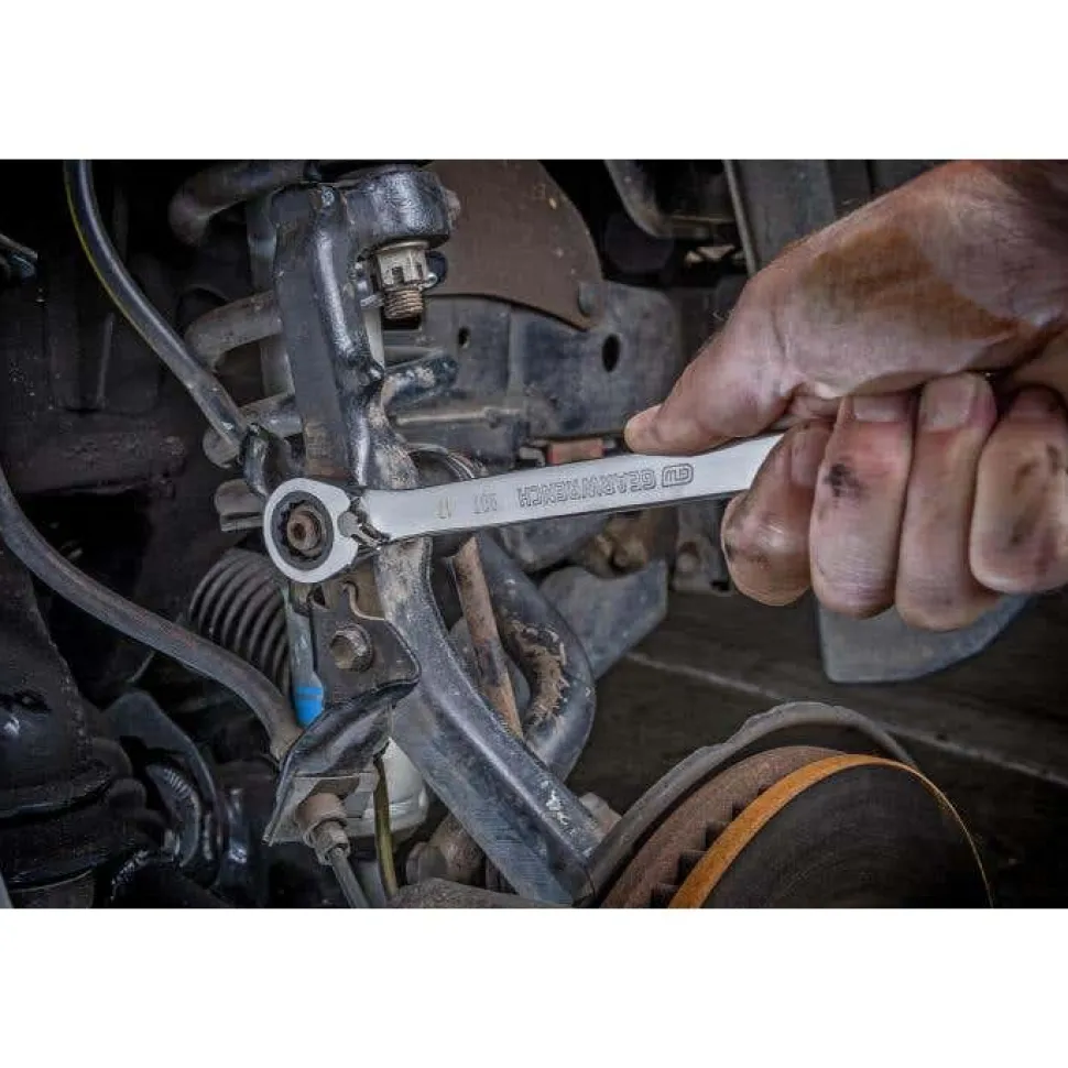 GEARWRENCH 90-tooth reversible ratcheting wrench swing arc of just 4° turns fasteners in extremely tight spaces. Longer, wider beam delivers improved reach, leverage, and comfort. Large color-coded SAE/metric markings make size identification easy. All exceed ASME performance specs and come with the trusted GEARWRENCH Limited Lifetime Warranty.