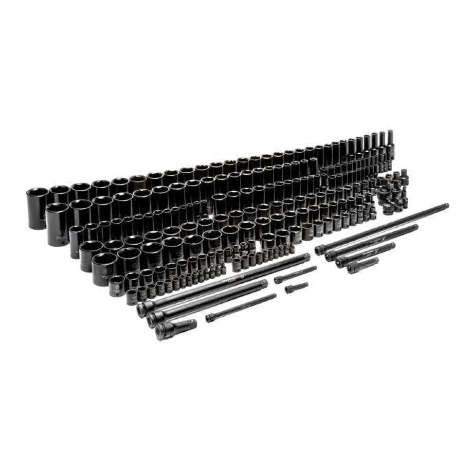 The GEARWRENCH 80972 209 Piece ¼” Drive, 3/8” Drive, ½” Drive SAE & Metric, Standard & Deep, 6 Point Impact Socket Master Set, provides the full range of sockets and impact drive tool accessories to cover a full range of fastener sizes from 3/16” – 1-1/2” & 4mm – 36mm. All of the 6-point standard and deep impact sockets within the set feature high-visibility laser-etched markings and secondary hard stamped size markings provide quick size identification. The SAE and metric sockets are made from Chrome molybdenum alloy steel (Cr-Mo) for exceptional strength and durability, have a manganese phosphate finish to resist corrosion with off-corner loading design to reduce fastener rounding. The sets impact drive tool accessories include: impact universal joints, to provide angled access to more fasteners, impact extension bars, to provide additional reach and access to more fasteners, and impact adapters, allowing the impact drive tools to work with additional drive size of sockets.escription