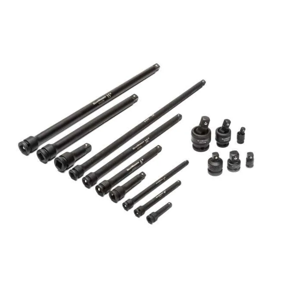 - Impact extensions and universal joints provide greater access to more fasteners