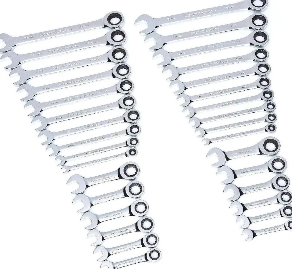 With a thin head shank that will let you in to almost any area and a special set of stubby wrenches that can squeeze into even tighter spots, the GEARWRENCH 32-pc combination wrench set, SAE/mm greatly expands your ability to remove or tighten any fastener. With sizes in both metric and in., the set has the range you want. The 12 points of contact on the ratcheting box end ensure better grip with no slip, while the open end lets you finish the job with ease.