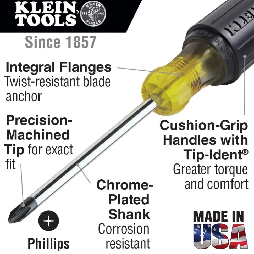 The Klein Tools 7-Inch (177.8 mm) Phillips-Tip Screwdriver features a durable black tip that is precision-forged and ground with square edges to fit screw openings securely. Its shaft will not bond or twist in normal use due to integral flanges that provide an extra-strong, torque-proof anchor in the handle. This screwdriver is made of high-quality tempered steel.