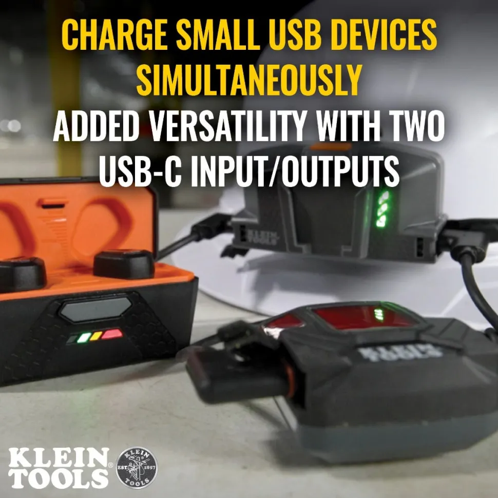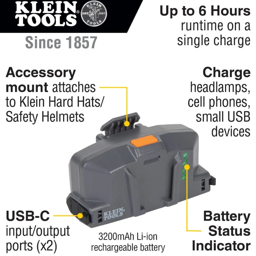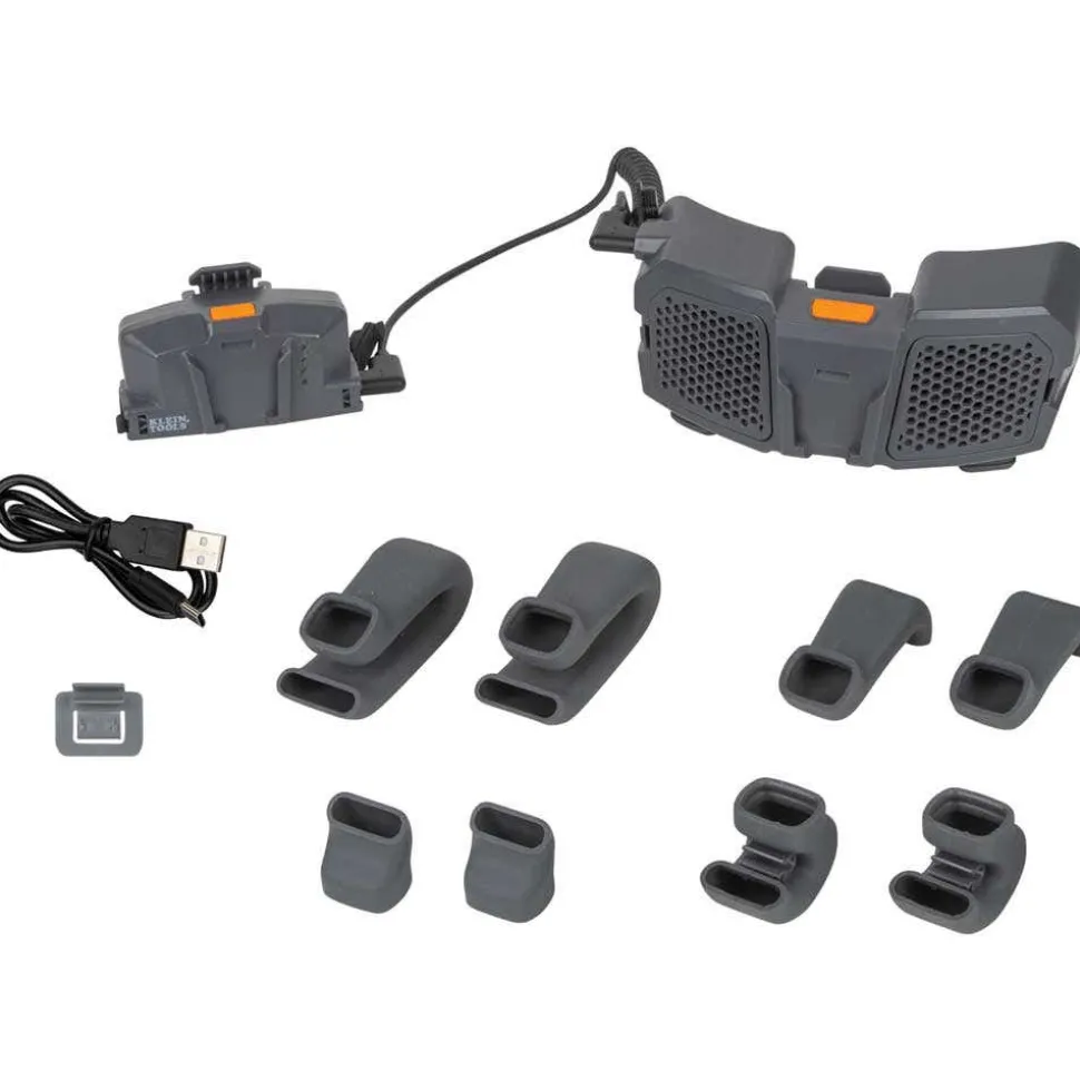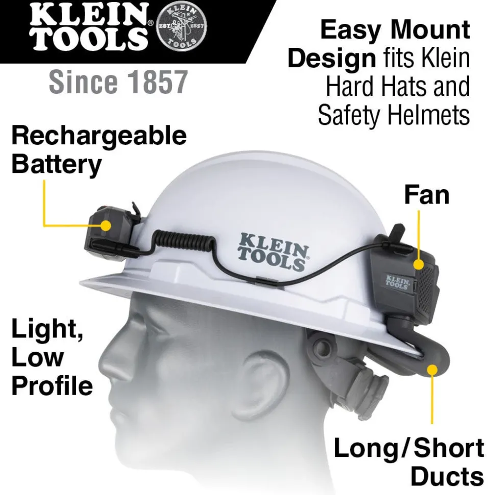 The Klein Tools Cooling Fan (Cat. No. 60155) is designed for use with Klein Tools’ hard hats and safety helmets with patent-pending accessory mounts for easy attachment and removal. The dual-fan design forces outside air into the shell to push out stale hot air, facilitating cooling, Included long and short ducts can be configured 16 different ways for efficient airflow. Powered by a detachable, rechargeable lithium-ion battery (Cat. No. 29025) that can also charge other small USB devices.