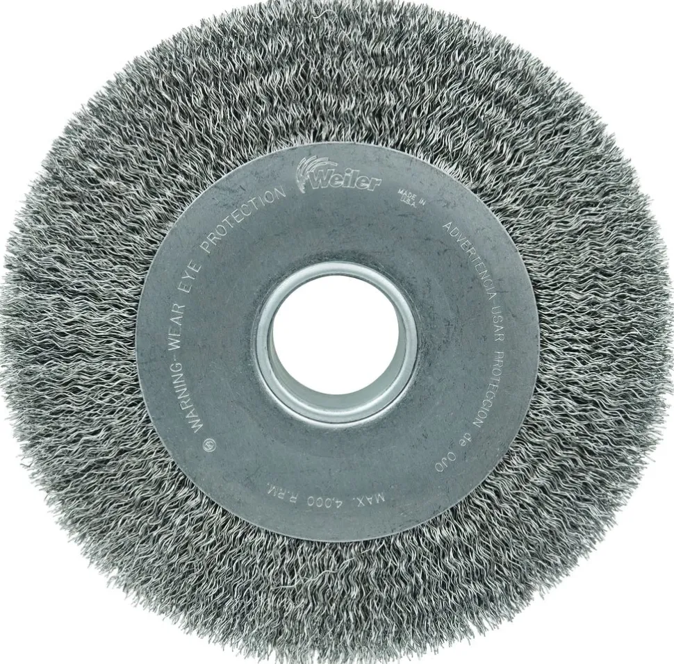 Weiler 10″ Wide Face Crimped Wire Wheel provide a flexible brushing action and consistent performance for demanding light-duty cleaning and deburring applications on steel, armored steel, cast iron, ductile iron and tool steel parts. Maximum wire density and aggression and a wider face width to cover more area. 2″ arbor hole for use on CNC/milling/automatic machine, bench and pedestal grinders.