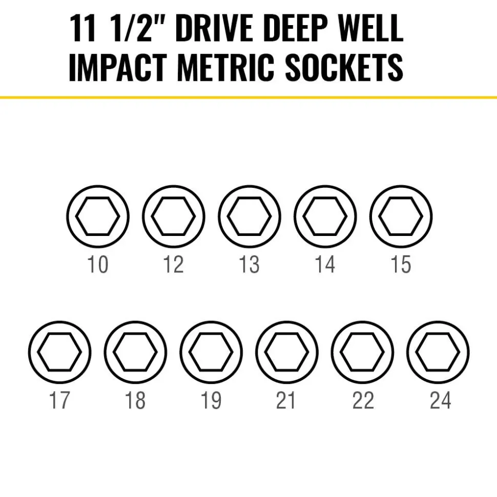 - Socket Set contains most common metric deep-well impact socket sizes up to 24 mm
