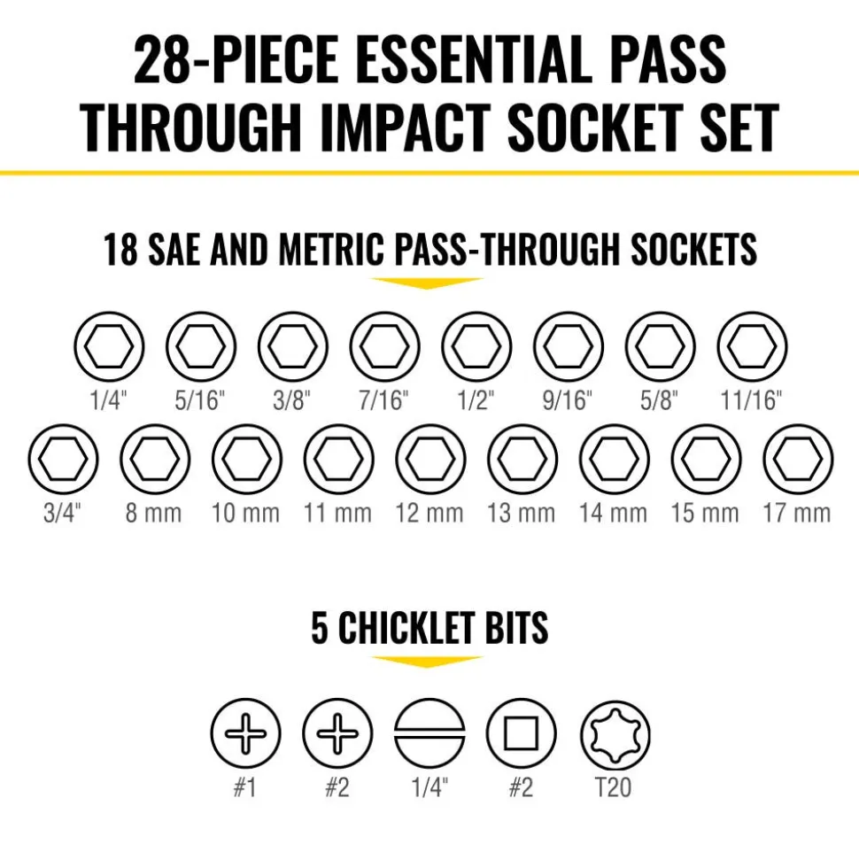 - 28-Piece Socket Set features: #1, #2 Phillips, 1/4-Inch slotted, #2 square, T20 TORX® , and socket sizes: 1/4, 5/16, 3/8, 7/16, 1/2, 9/16, 5/8, 11/16, 3/4-Inch and 8 to 17 mm