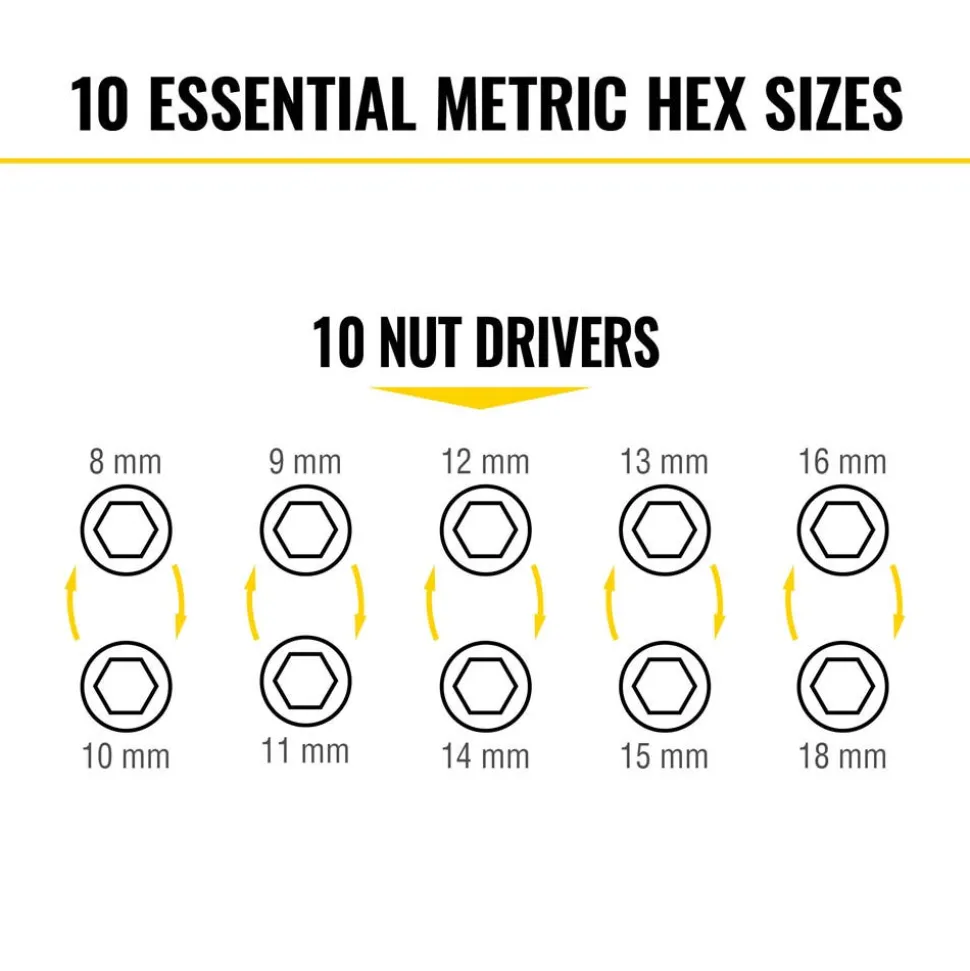 - Set includes 8 x 10, 9 x 11, 12 x 14, 13 x 15, and 16 x 18 mm socket sizes