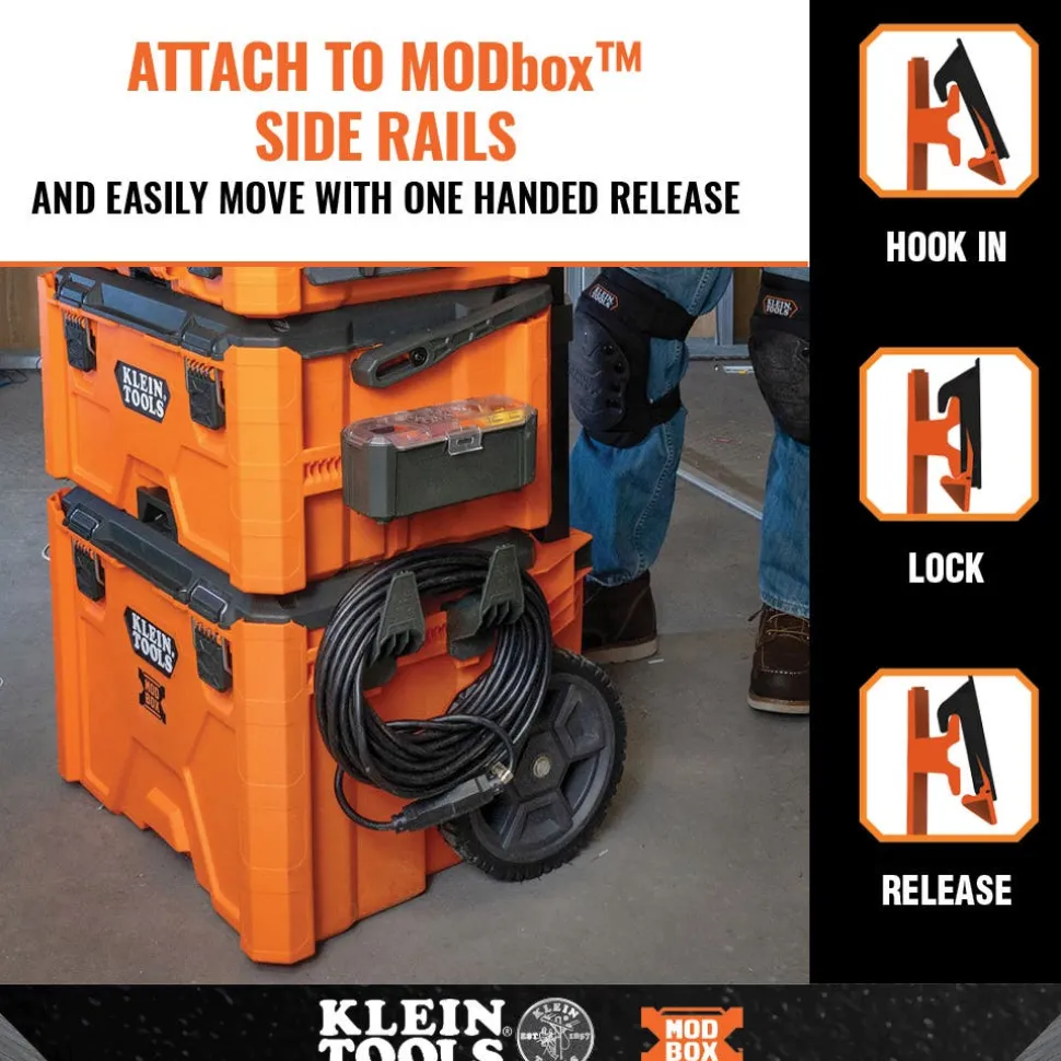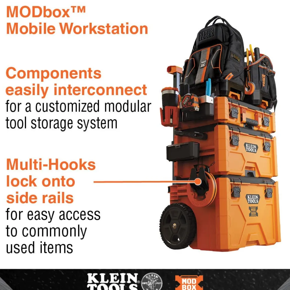 Klein Tools MODbox™ Multi-Hook Rail Attachment secures items to the rails for accessibility at the jobsite. Versatile Multi-hooks come two in a pack and can be placed together to secure larger items such as fish tape. Place separately to secure items such as extension cords. Easily connects to the rail system on MODbox™ components to make a custom mobile workstation.