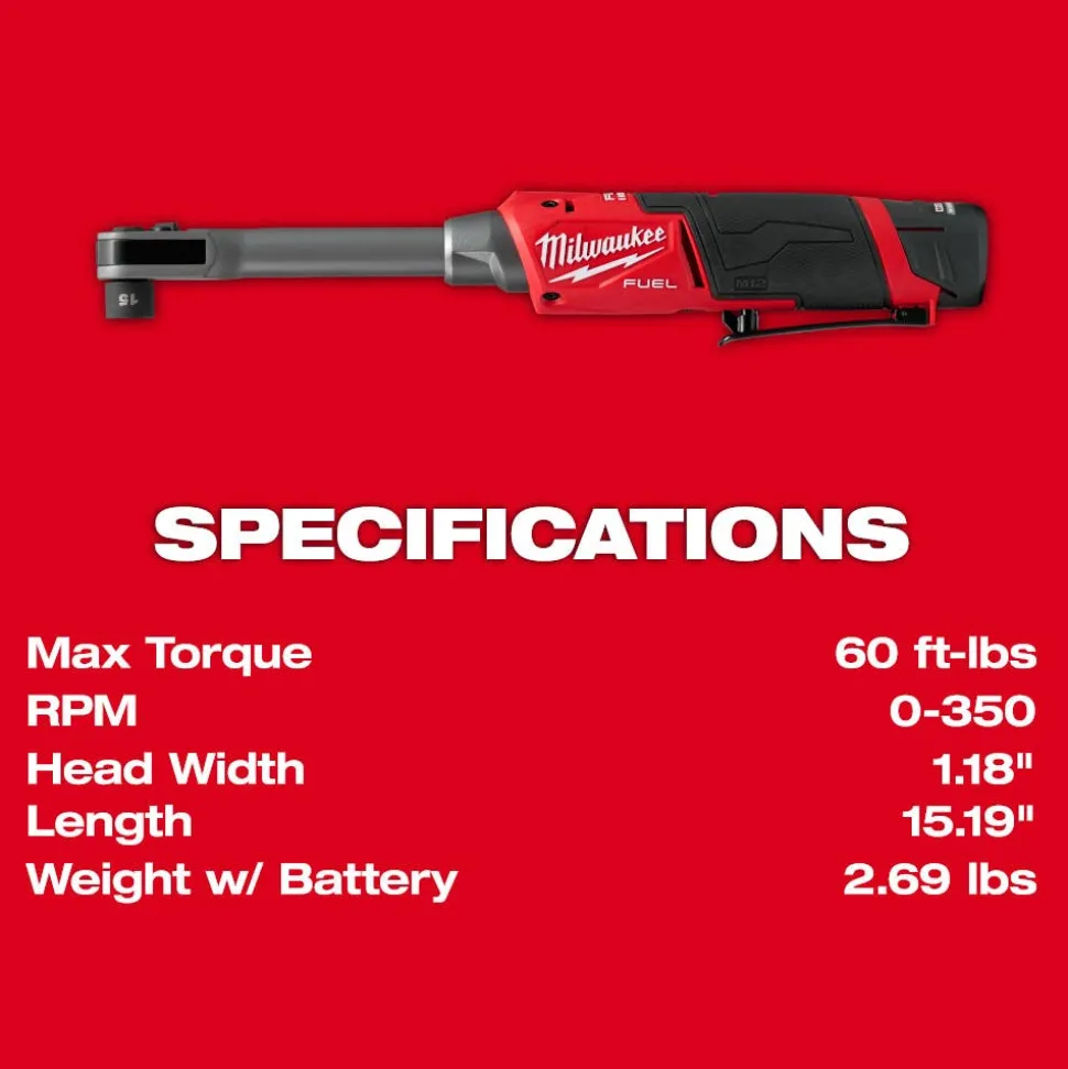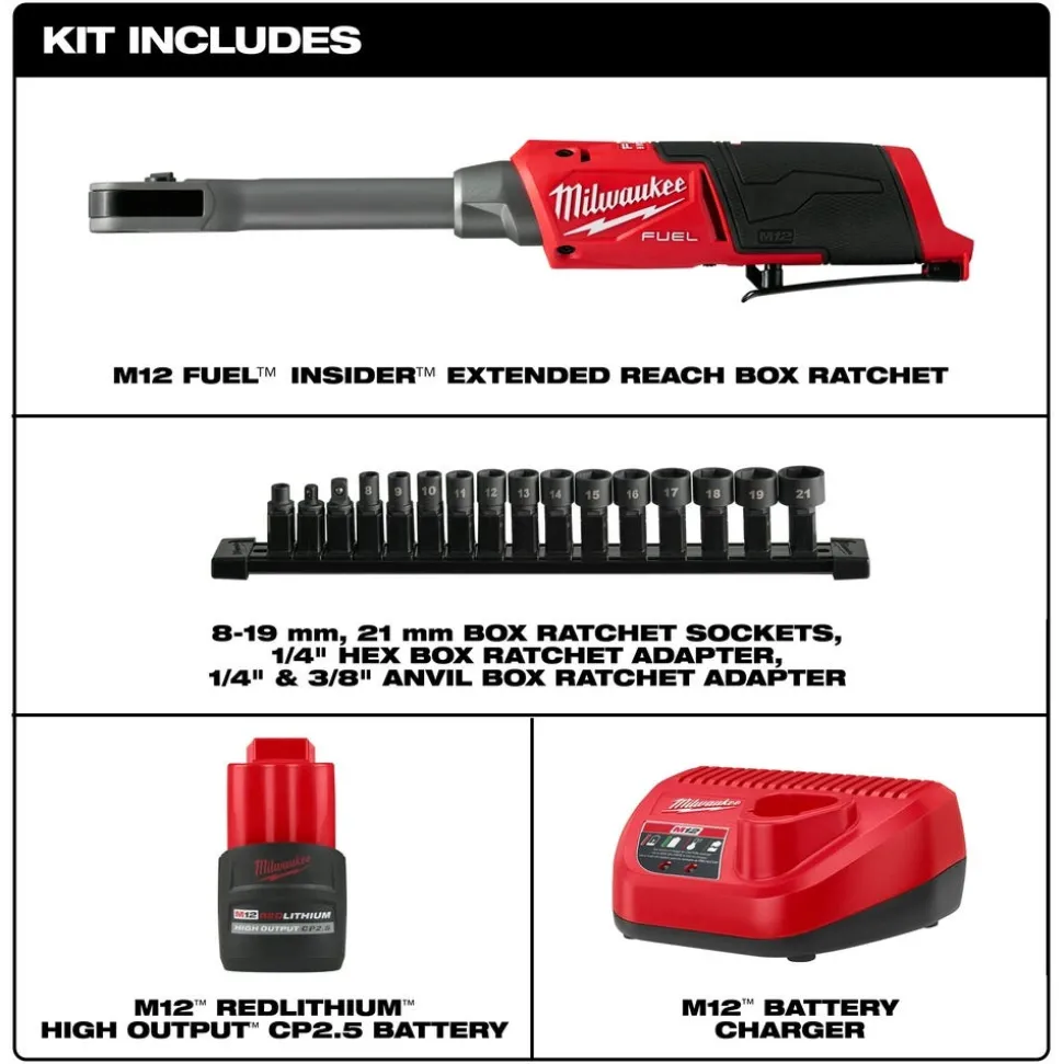 | Package Contents | (1) M12 FUEL Insider Extended Reach Box Ratchet, (1) M12 Charger, (1) M12 High Output CP 2.5Ah Battery, (1) Socket Rail, (1) 8-19, 21mm Socket Set, (1) 1/4″ Hex Adapter, (1) 1/4 Drive Anvil Adapter, (1) 3/8″ Drive Anvil Adapter |