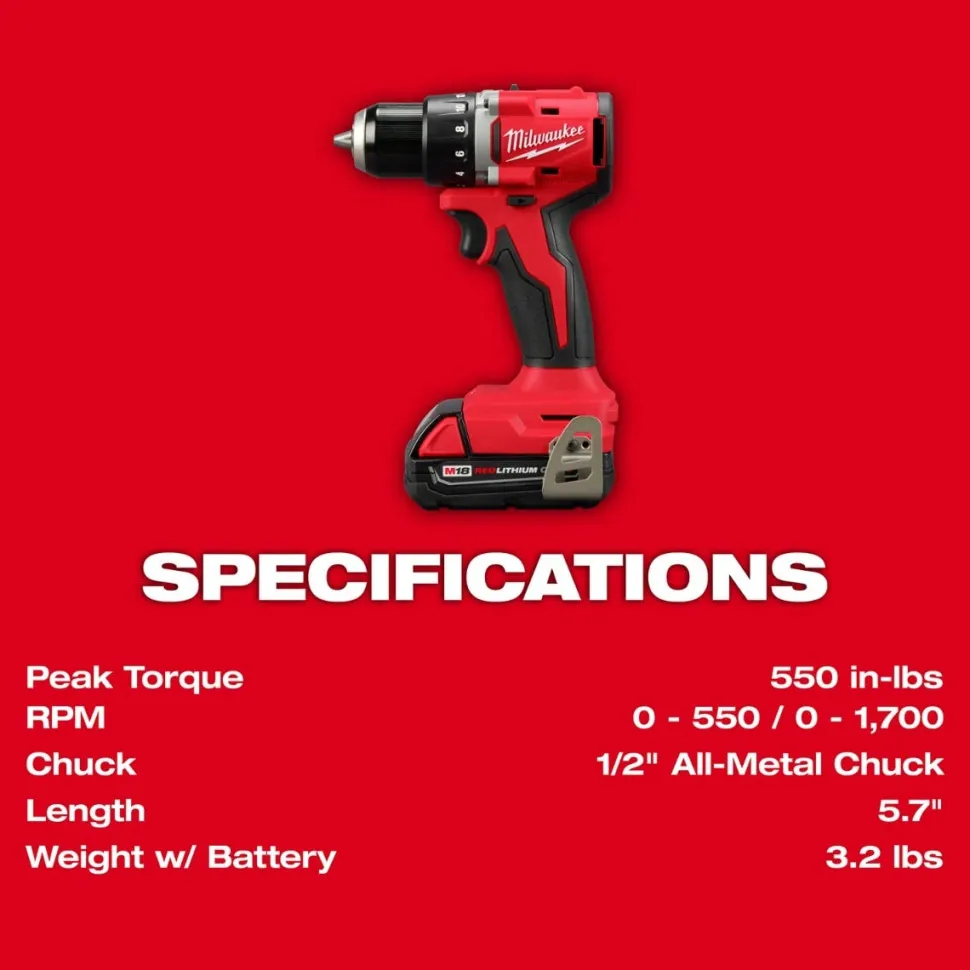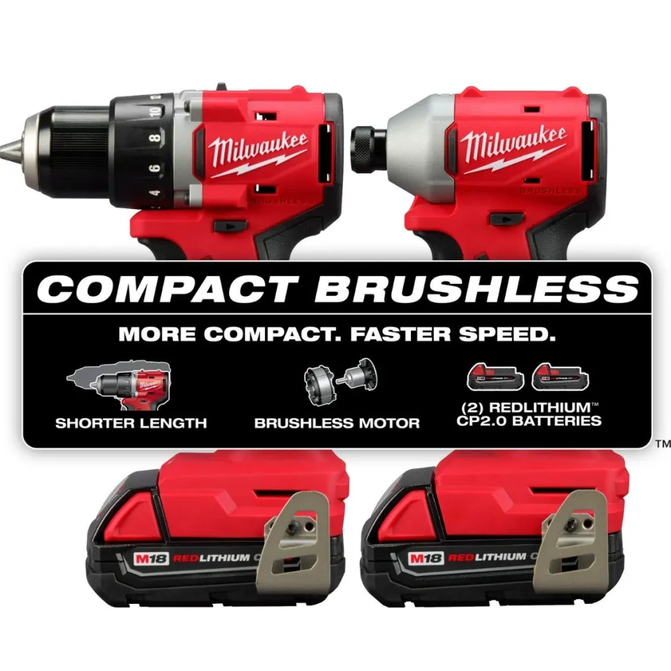 | Package Contents | (1) M18 Compact Brushless Drill Driver (3601-20), (1) M18 Compact Brushless Impact Driver (3650-20) (2) M18 REDLITHIUM CP2.0 Battery (48-11-1820), (1) M18 and M12 Multi-Voltage Charger, Contractor Bag |