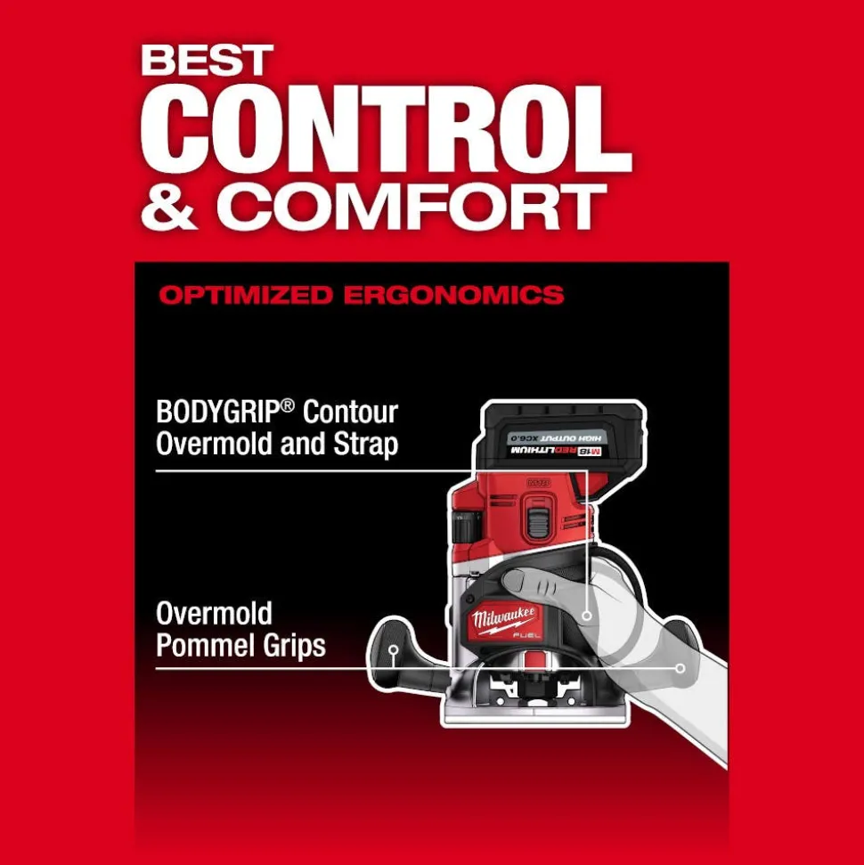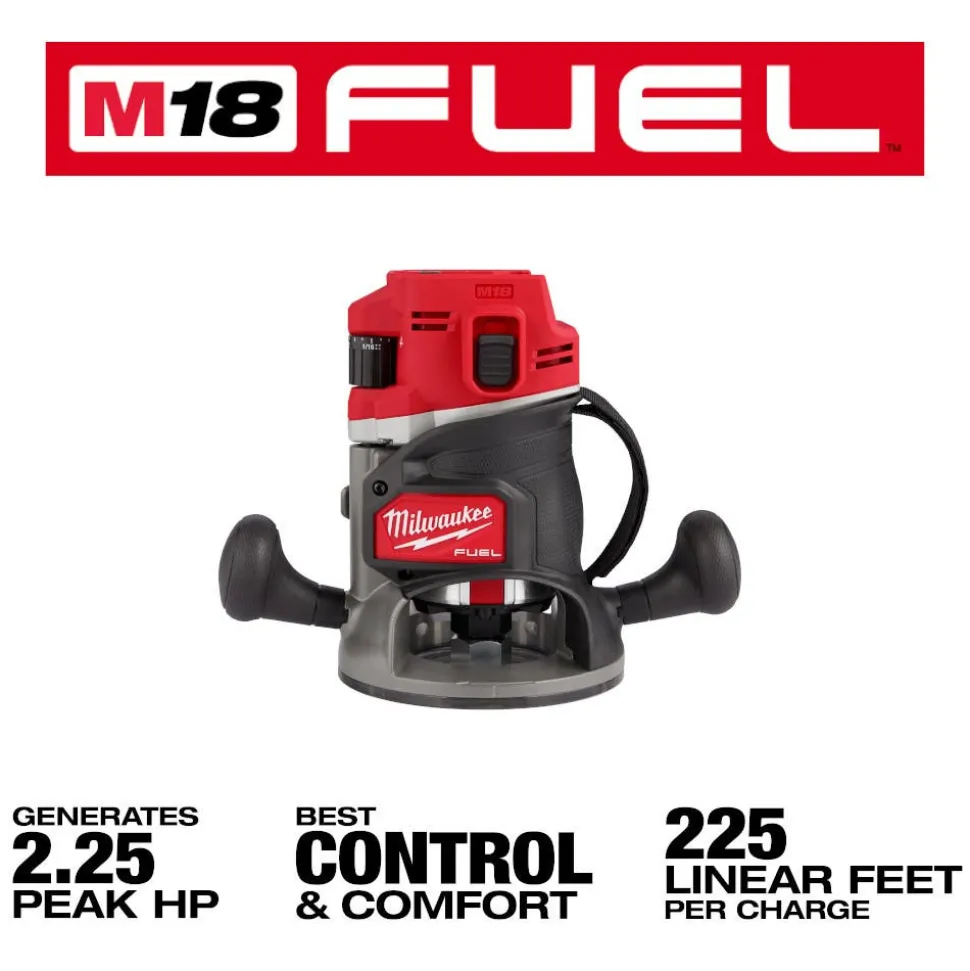 - Micro-adjust knob offers precise depth tuning at 1/64” increments and the macro-adjust button provides fast adjustments throughout the 2” of total fixed base travel.
