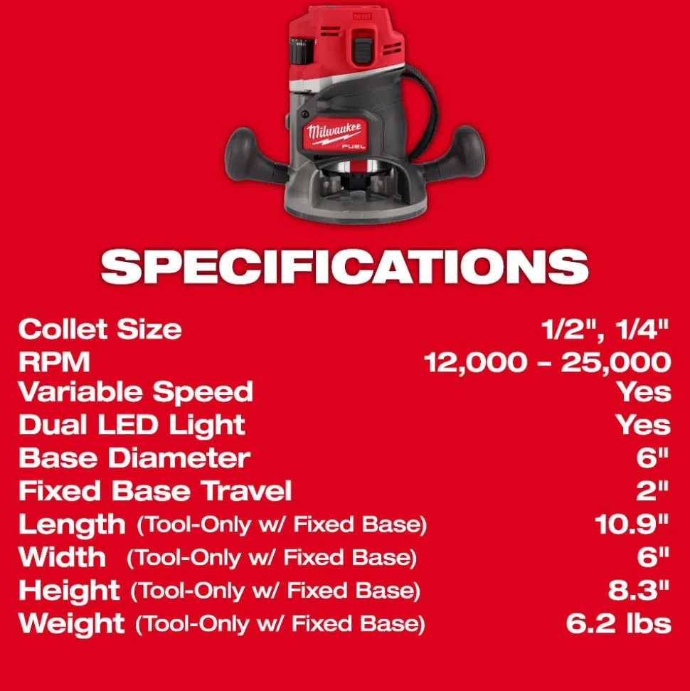 | Package Contents | 2838-20 1/2″ Router with Fixed Base, 1/2″ and 1/4″ Collets, Dust Shroud, Universal Hose Adapter, (2) Wrenches, Edge Guide and Template Base. Battery and Charger Not Included. |