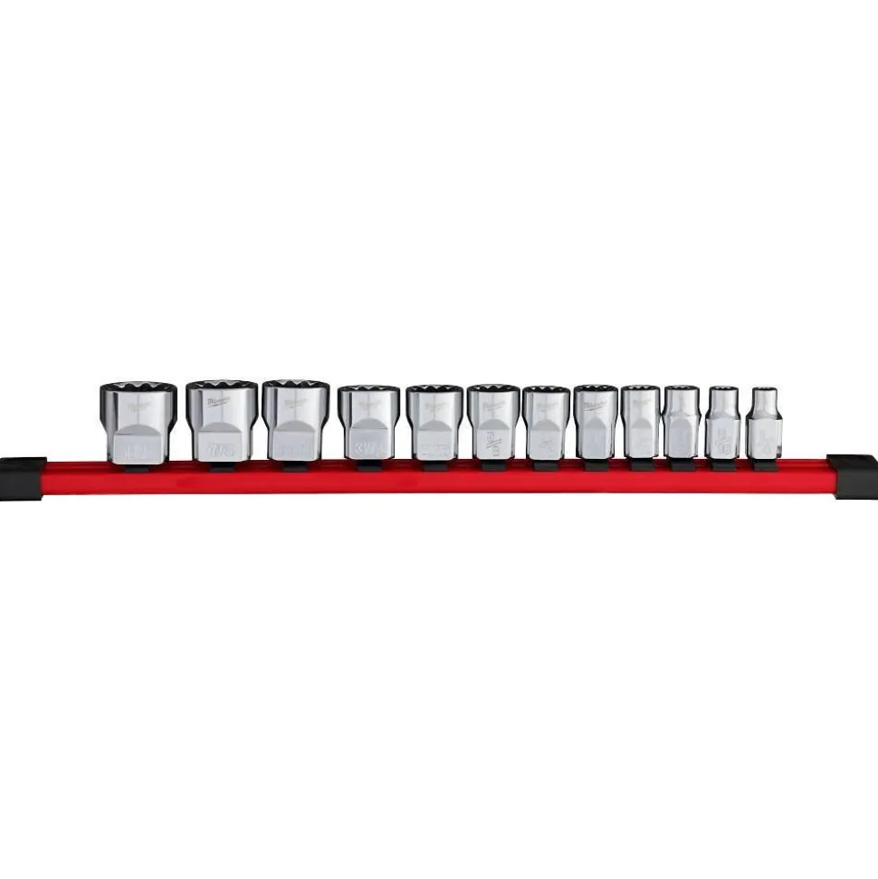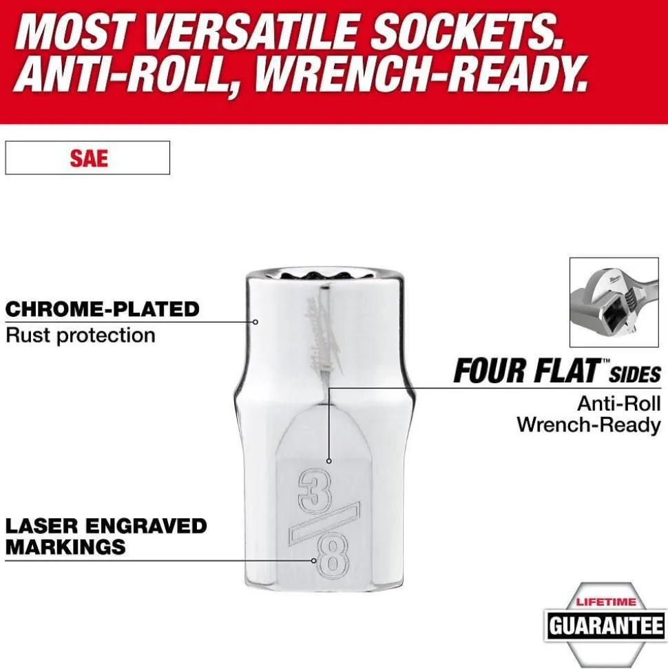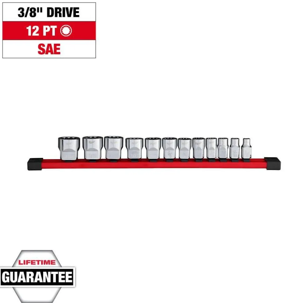 - (12) 3/8″ Drive 12-Point Socket Sizes: 1/4″; 5/16″; 3/8″; 7/16″; 1/2″; 9/16″; 5/8″; 11/16″; 3/4″; 13/16″; 7/8″; 15/16″.