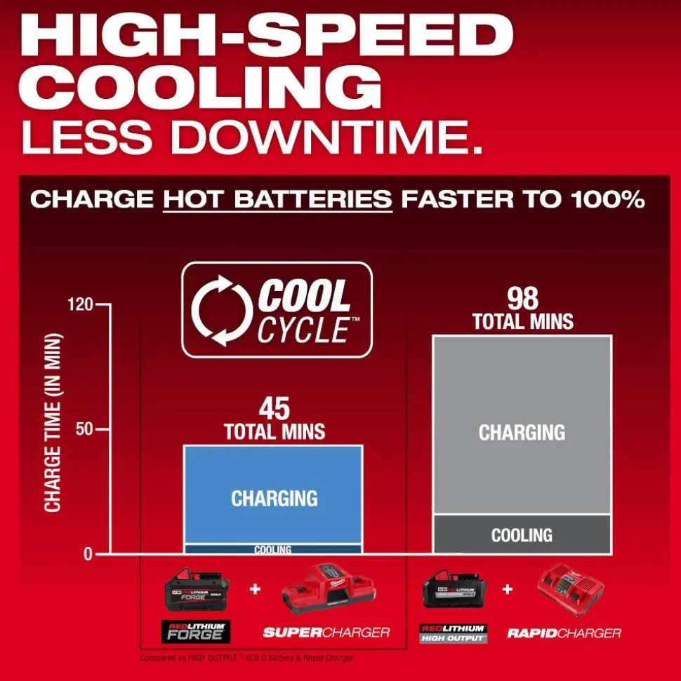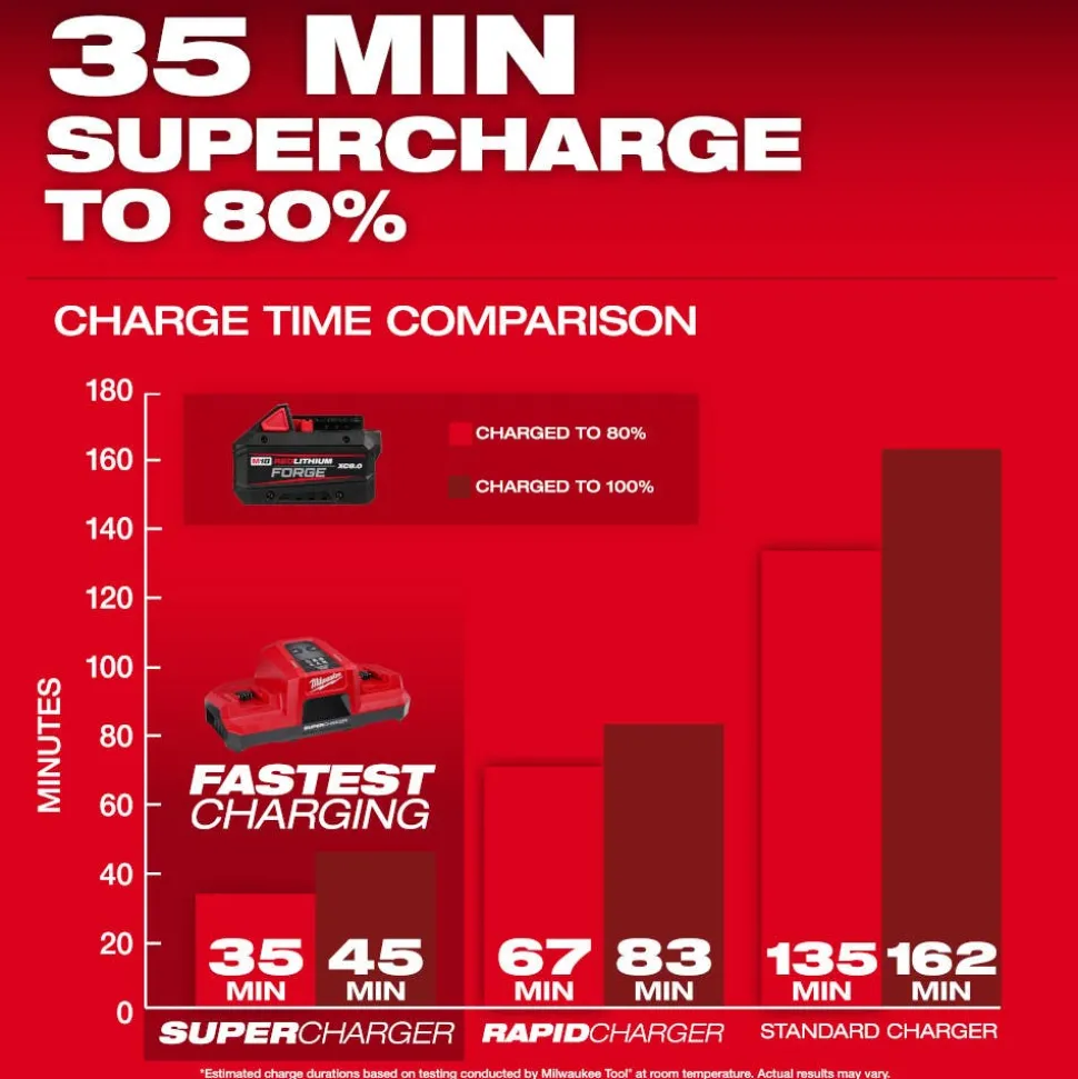 - 35min supercharge to 80% with the M18 Dual Bay Simultaneous Super Charger