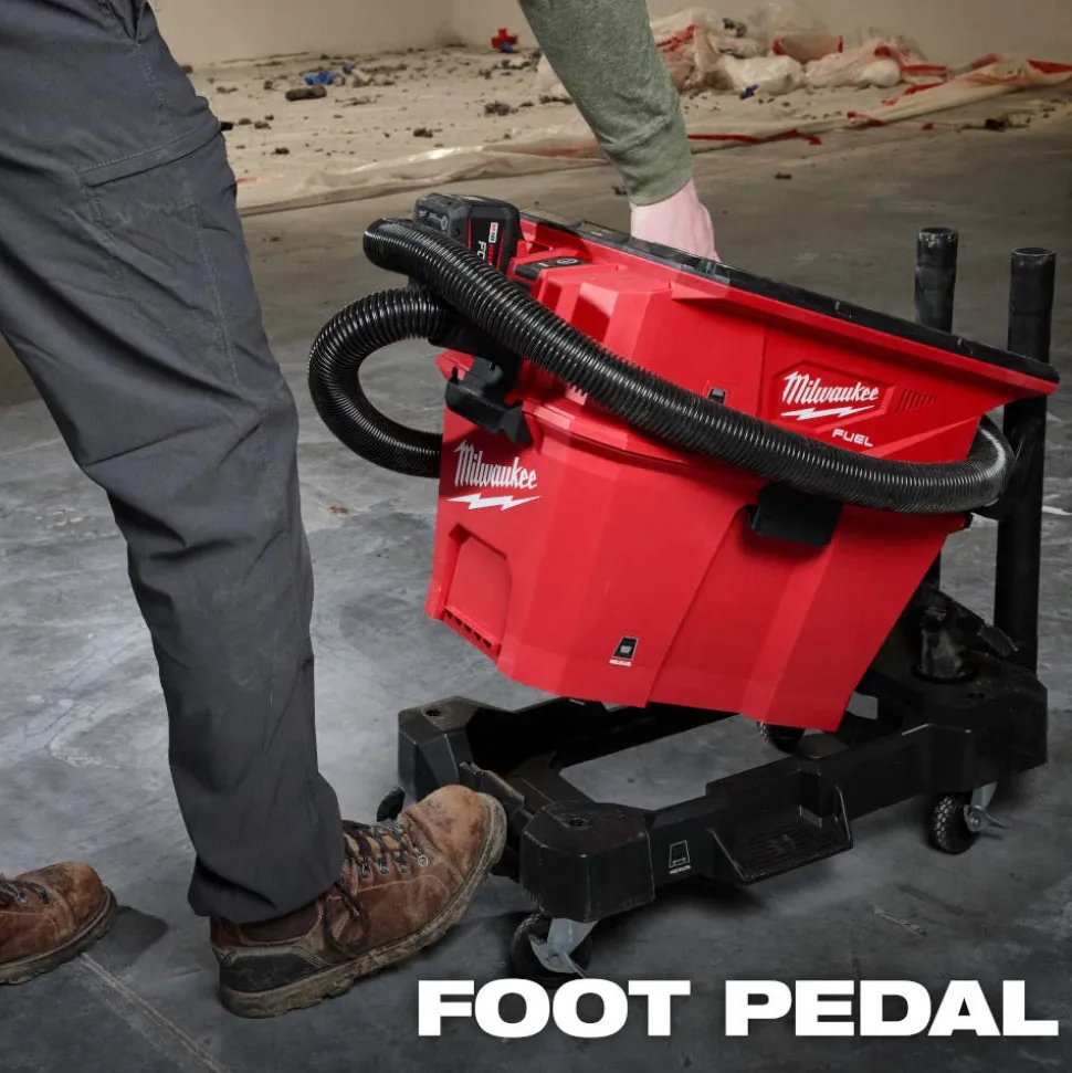 - Front foot pedal on the cart allows for easy tank and vacuum removal