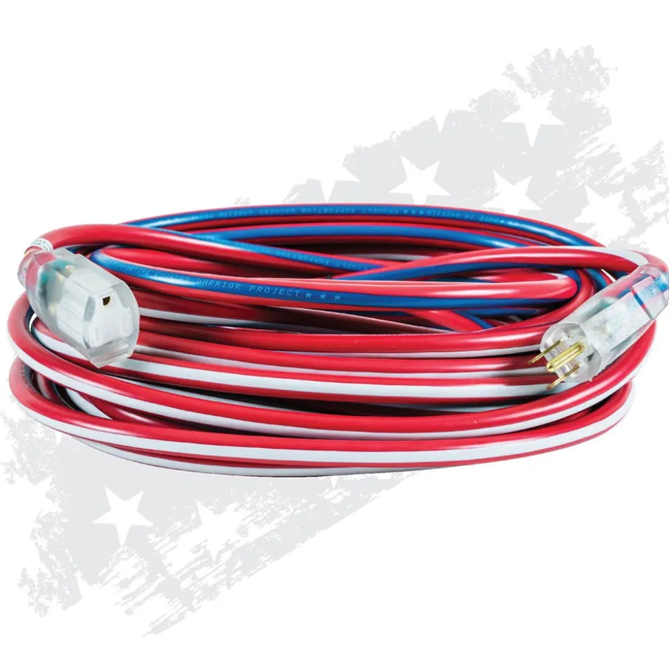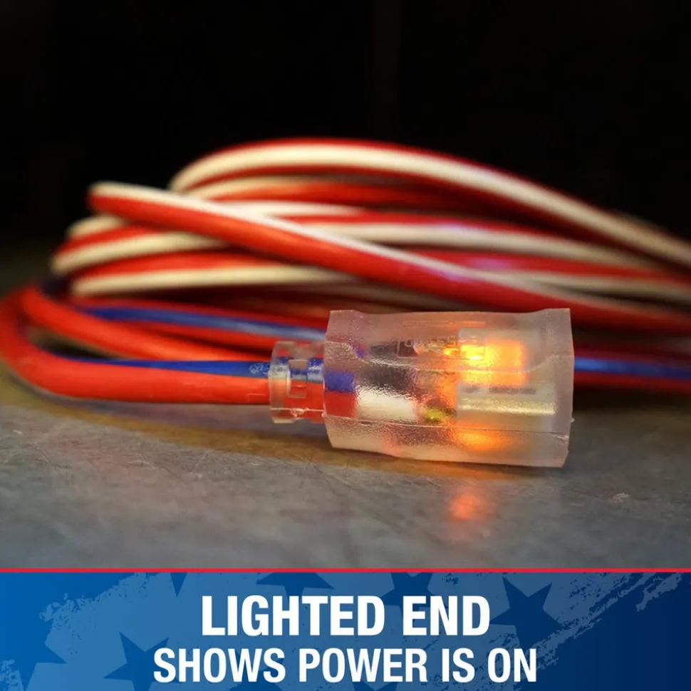 - Made in America: Display AMERICA’S COLORS on the jobsite with this patriotic striped contractor grade extension cord