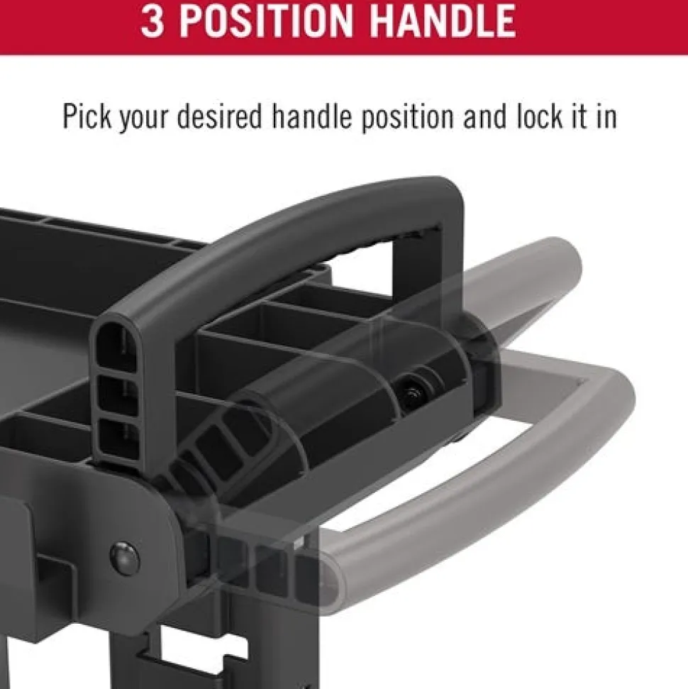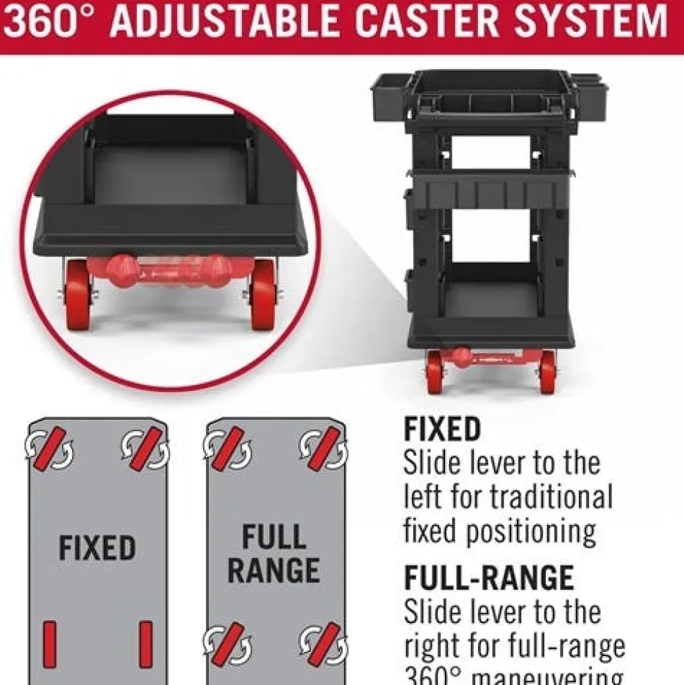 - Innovative caster system allowsfor a fixed front caster mode;which keeps the utility cartstraight when desired; orfull-range 360° movement.